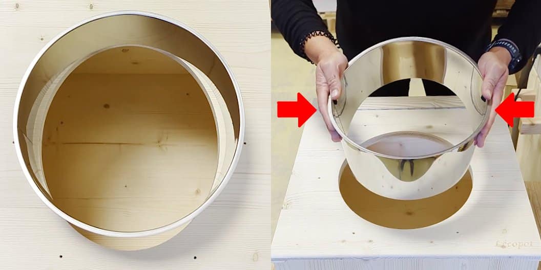 3. Insérez la bavette dans l’ouverture. Vous remarquez que le gabarit est de forme ovale. C’est la meilleure forme pour une ouverture de toilette. Mais les bavettes en inox sont de forme ronde. Pas de soucis ! Il vous suffit d’exercer une légère pression avec les mains de part et d’autre de la bavette pour lui donner une forme ovale et l’insérer sans peine dans le trou percé.
